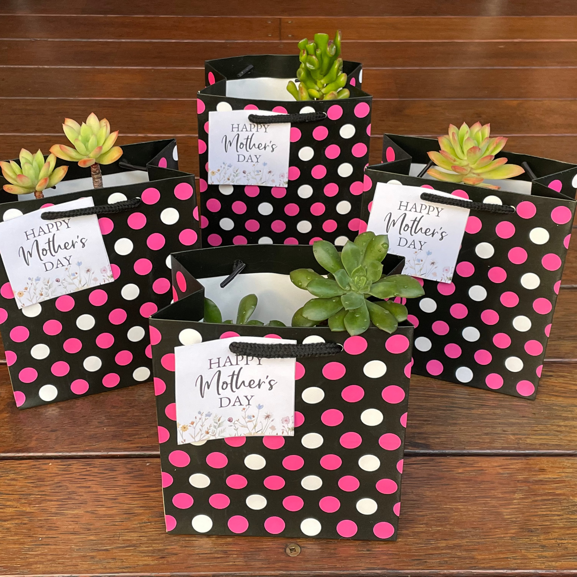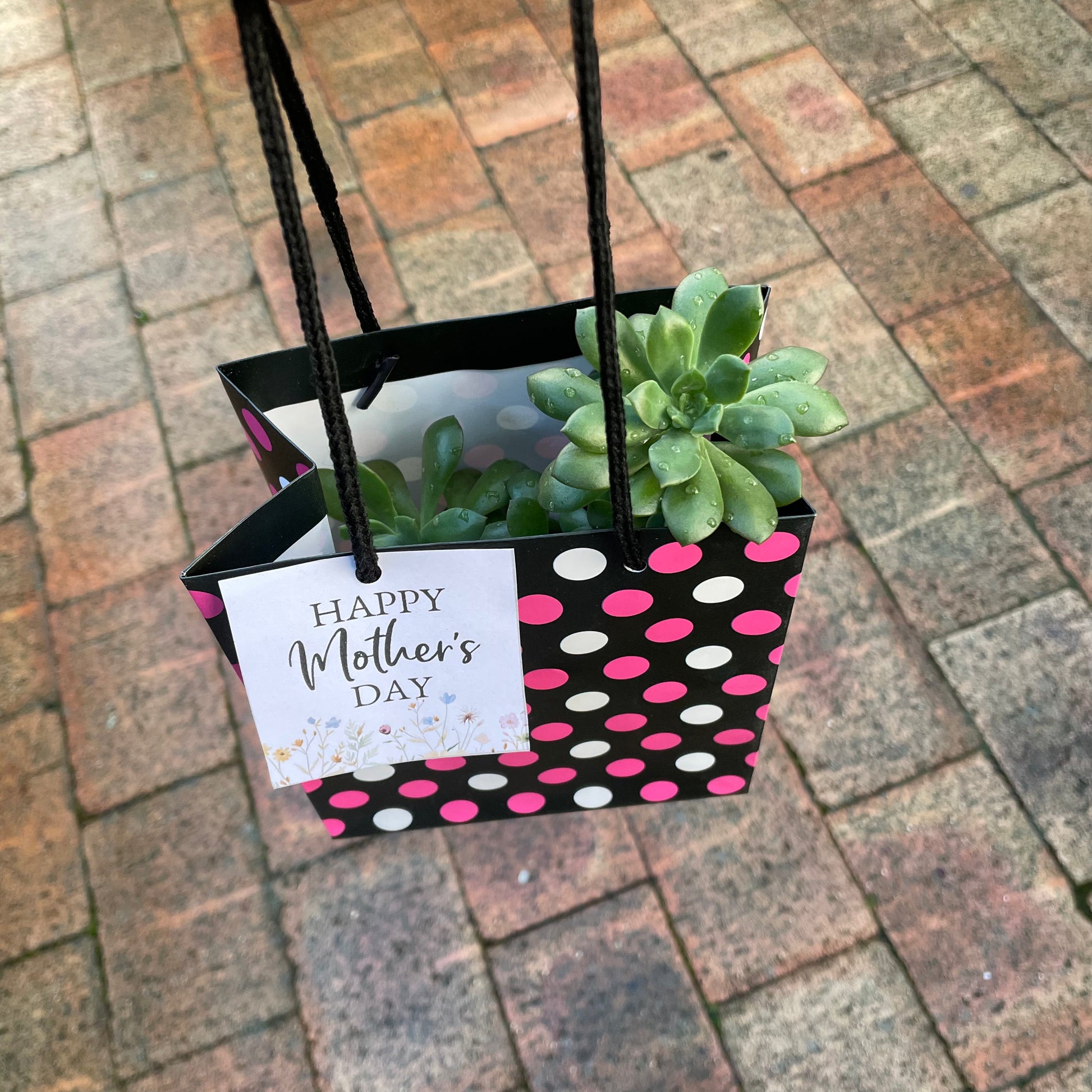 Celebrate Mother's Day with our beautiful succulent in a stylish pot, featuring a charming "Happy Mother's Day" sign. For your convenience, a cardboard hanging gift bag is included, making it easy to carry and present as a thoughtful gift.