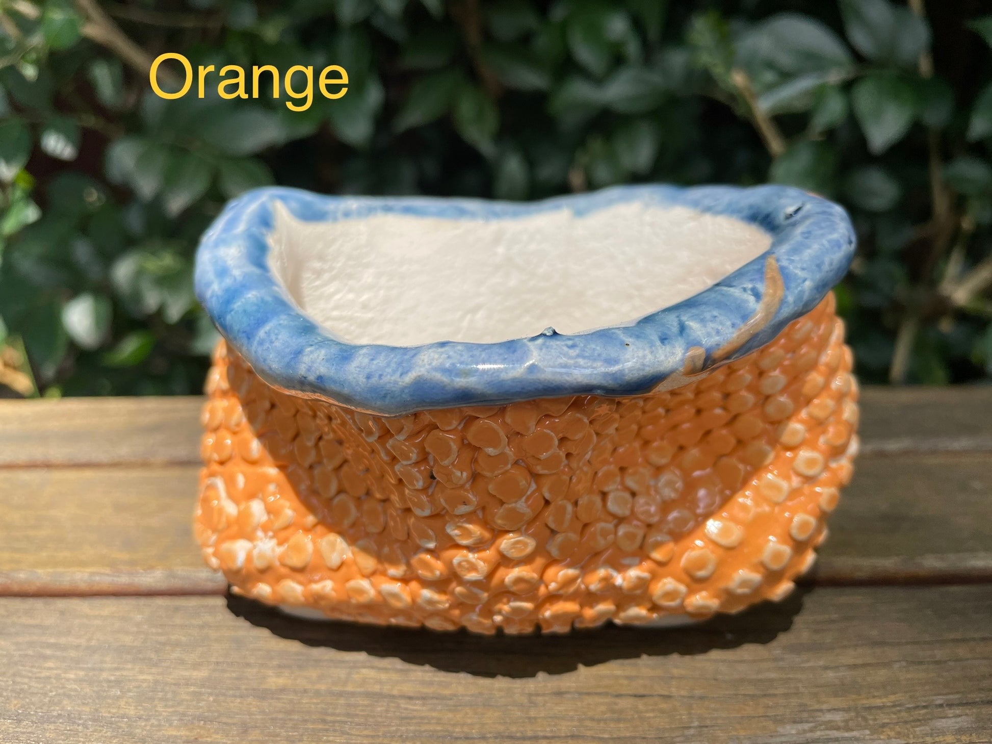 These handmade ceramic pots are breathable, making them perfect for growing succulents and cacti. Each pot features a drainage hole at the bottom. The creative design combines elements of a fish basket and a money bag, complemented by light pastel colors.
