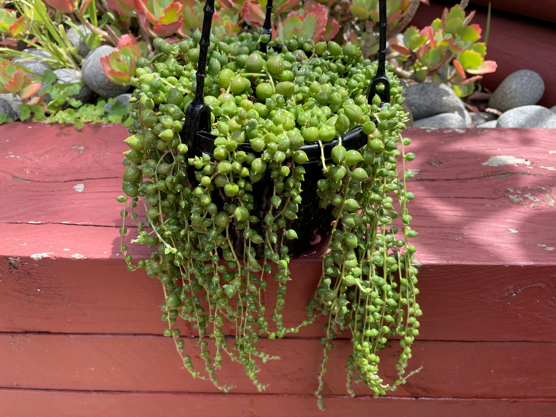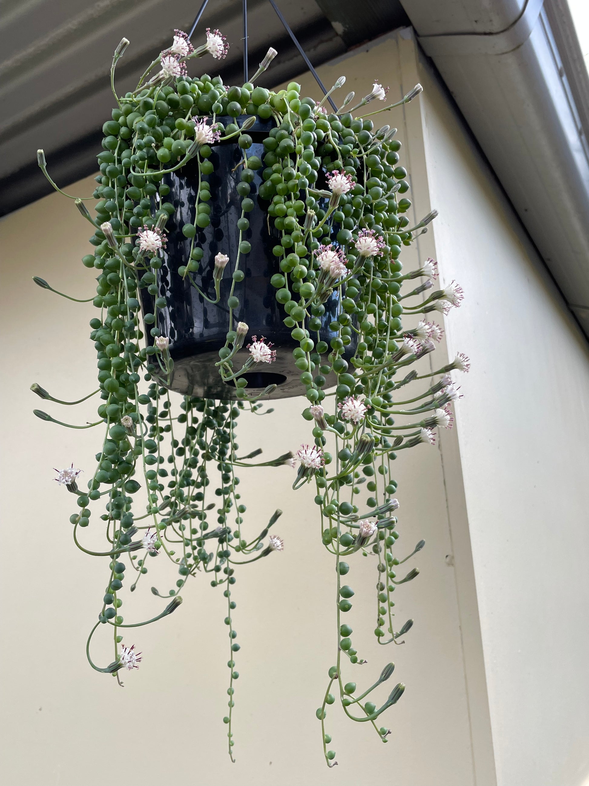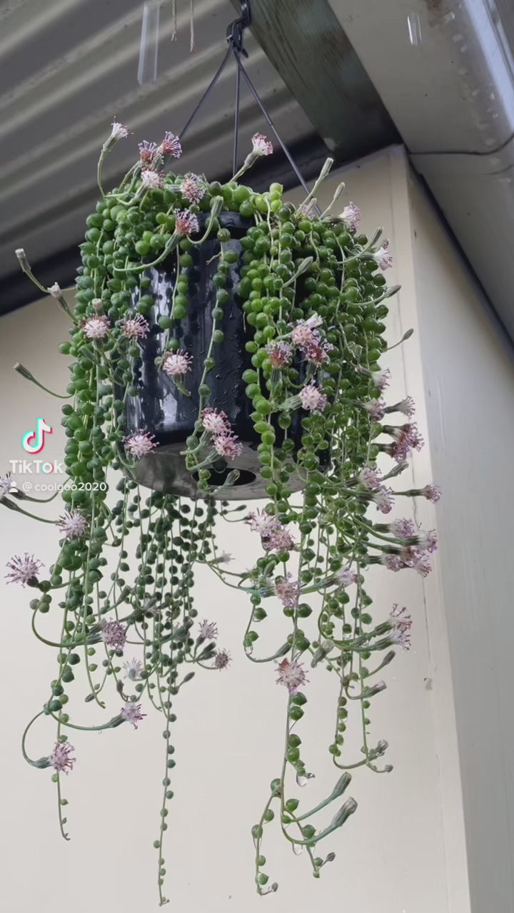 This String of pearls succulent has long vines that can reach 70 centimetres in length. The green “pearls” that hang from the stems.