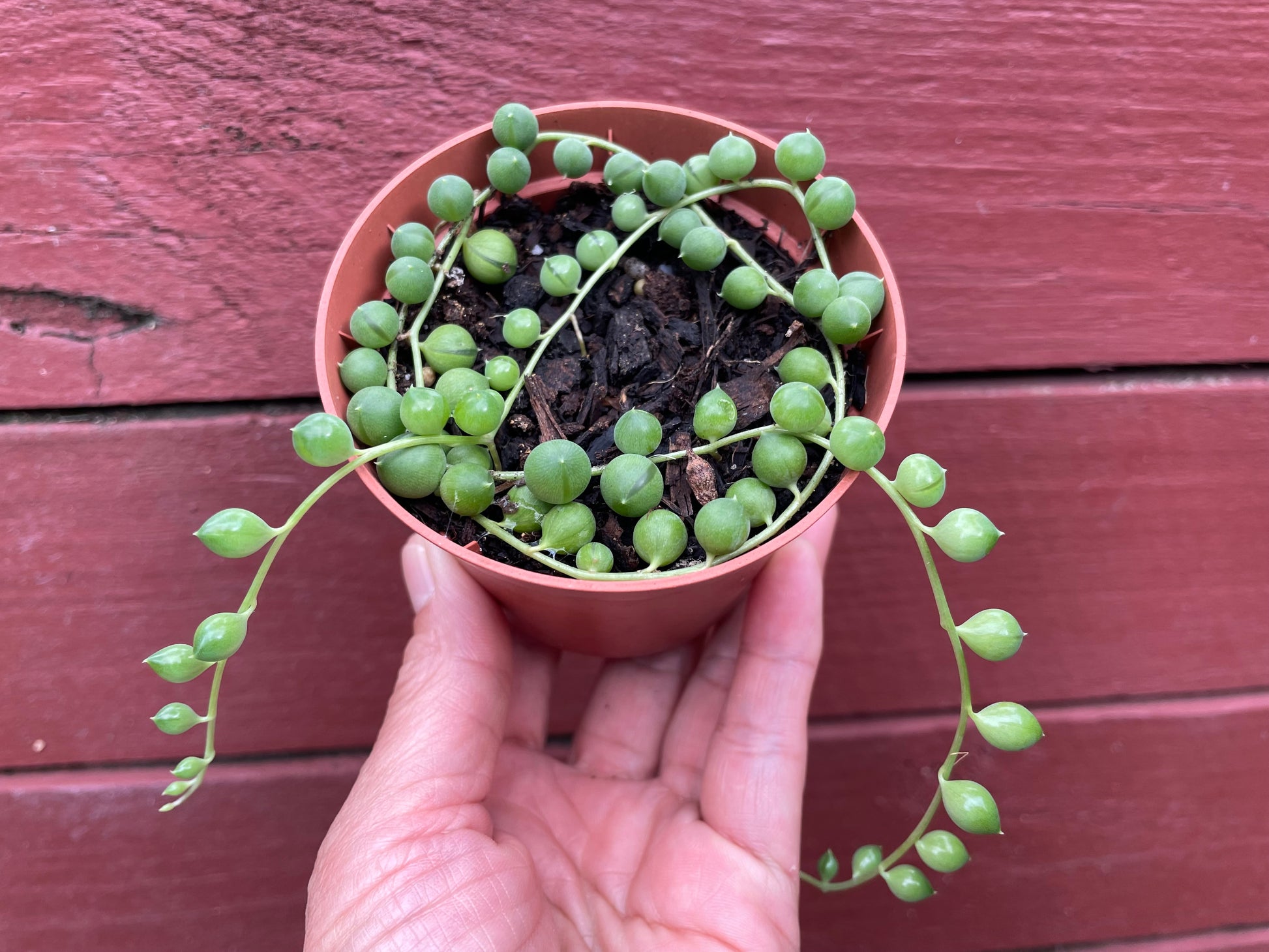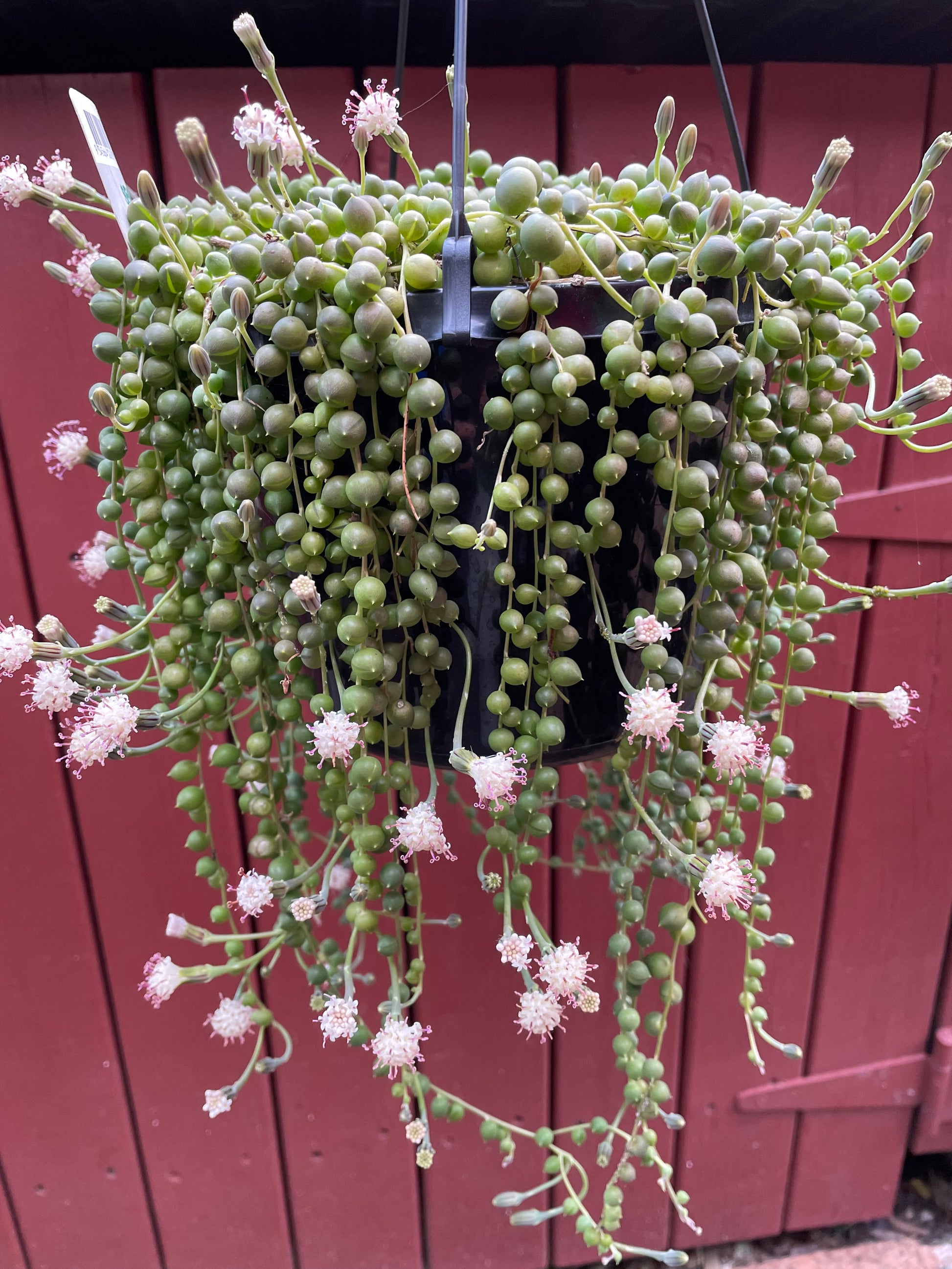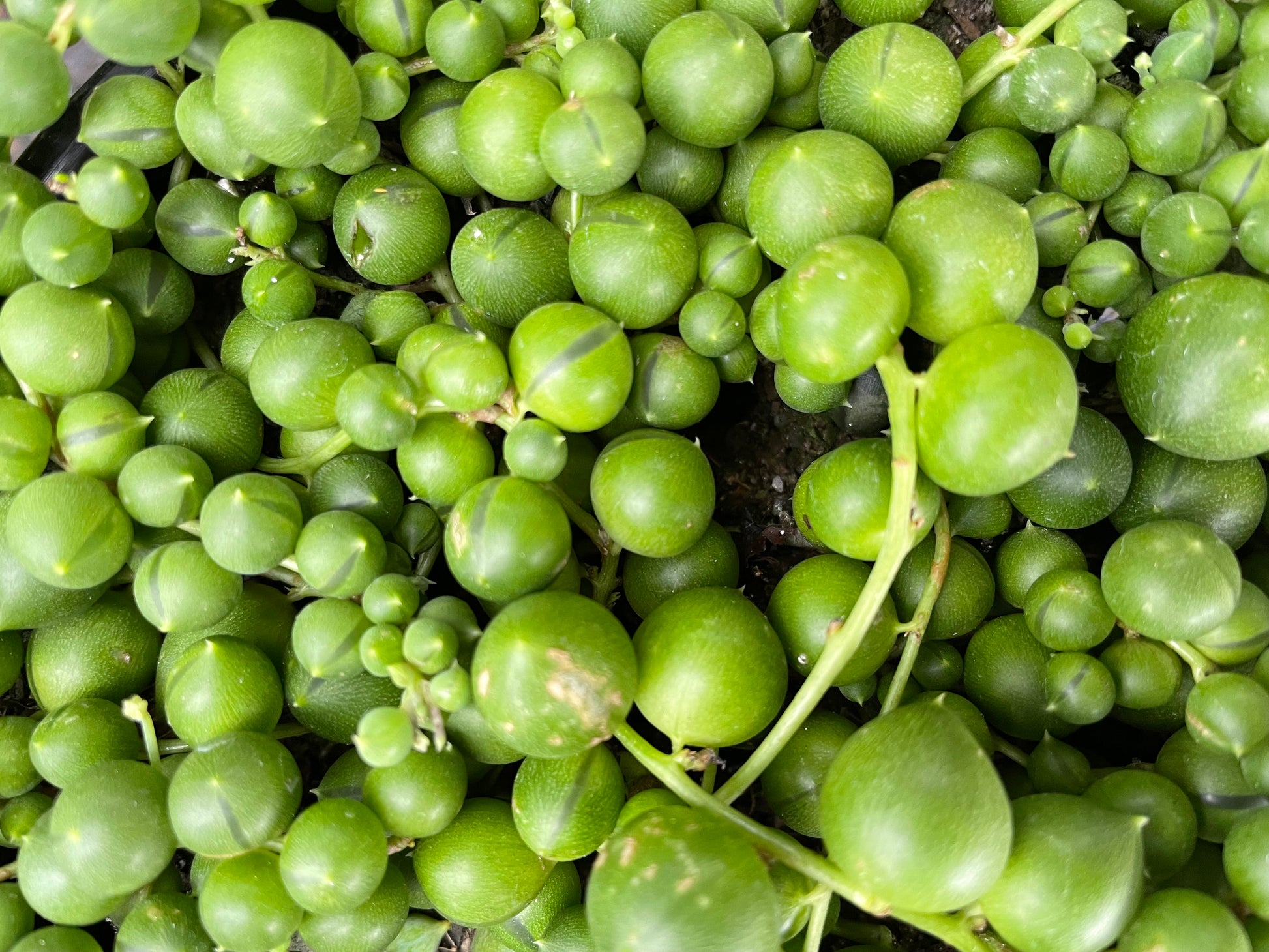 This String of pearls succulent has long vines that can reach 70 centimetres in length. The green “pearls” that hang from the stems.