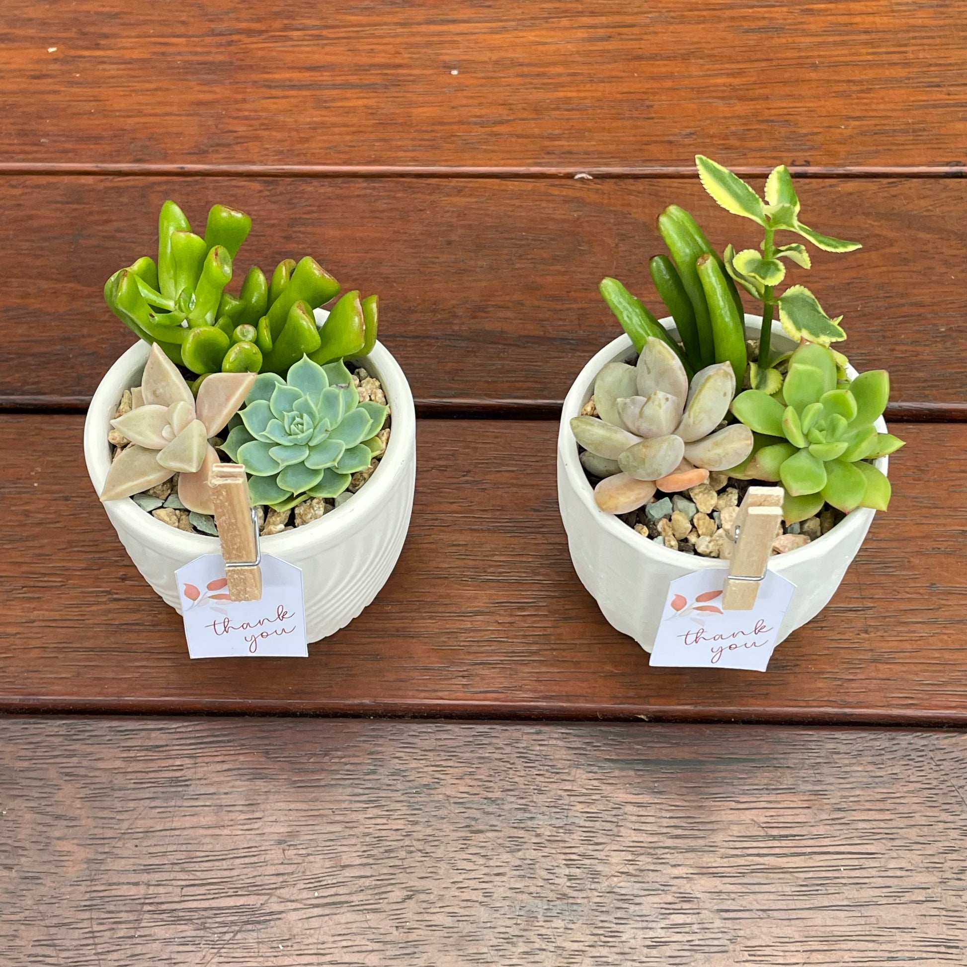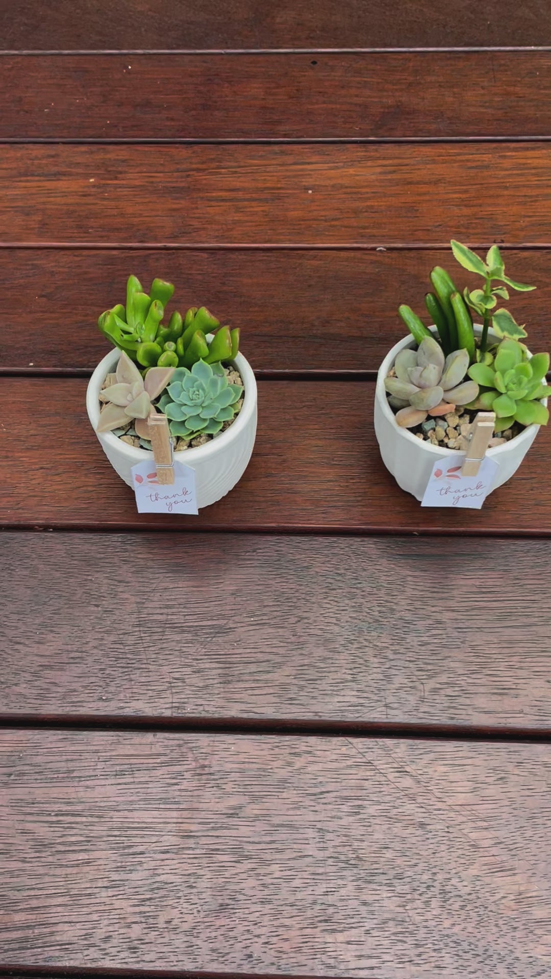Succulent favour, 7cm diameter, 6cm height, white round clay pot, minimum order 20 pots, only pick up from Gymea 2227. Listing plants are samples; you will receive similar plants depending on the season. You will need 10 days to prepare—$ 5.5 each, including succulent, pot, and white pebbles. Message me if you want a personalised tag, $0.5 each.