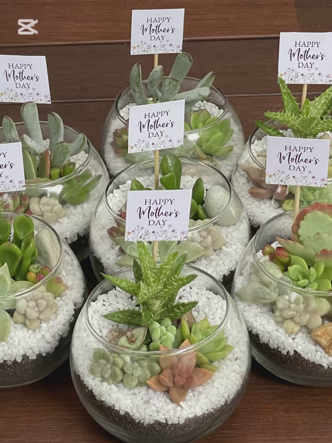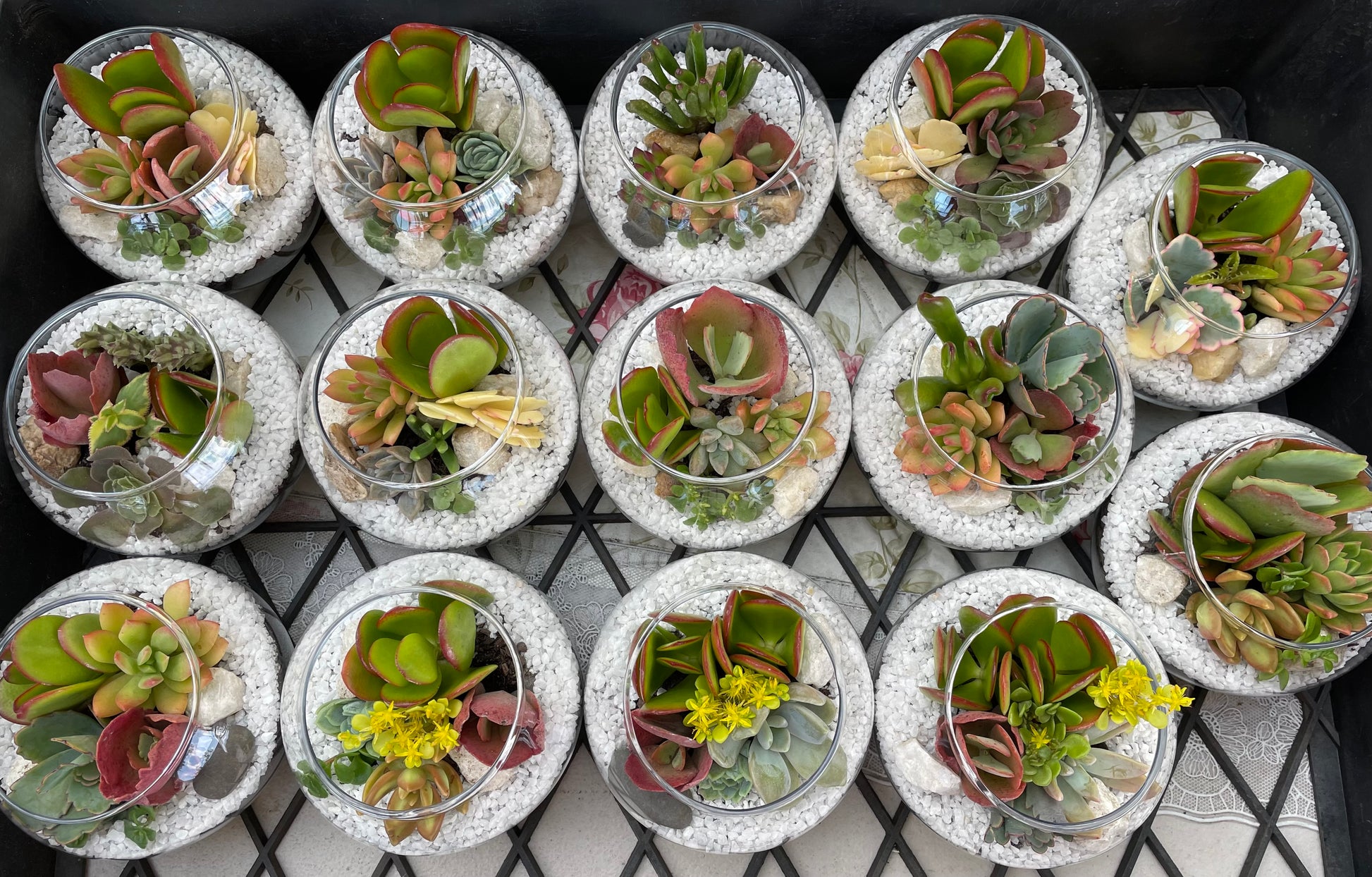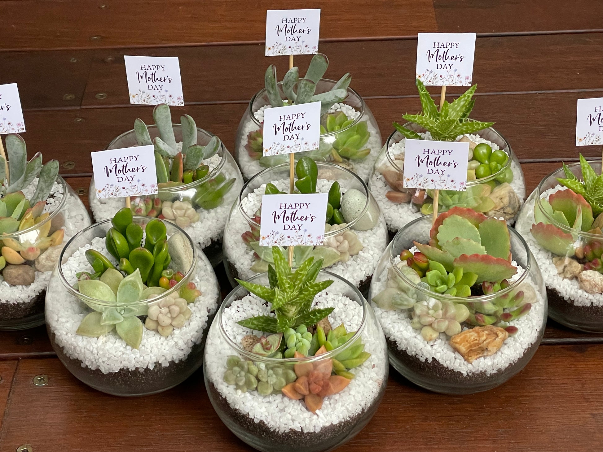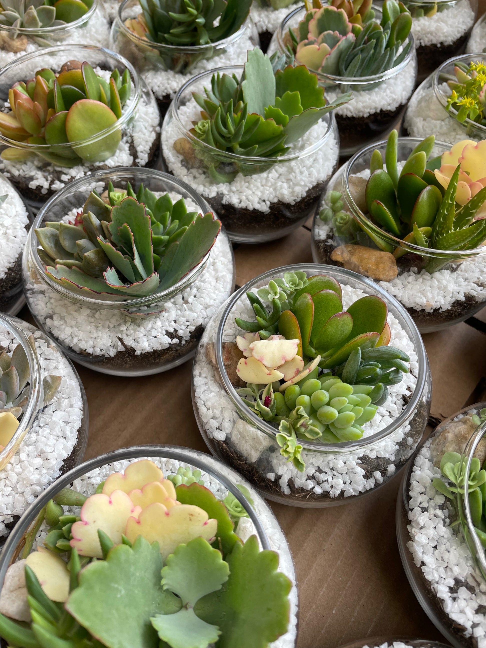 Succulent Favours: Explore a variety of succulent arrangements in glass pots with a 6.5cm open diameter, 10cm width, and 7.5cm height. Perfect for wedding party gifts, these are $12 each. A minimum order of 10 pots is required. They need 5 days to prepare. Pick up from Gymea 2227.