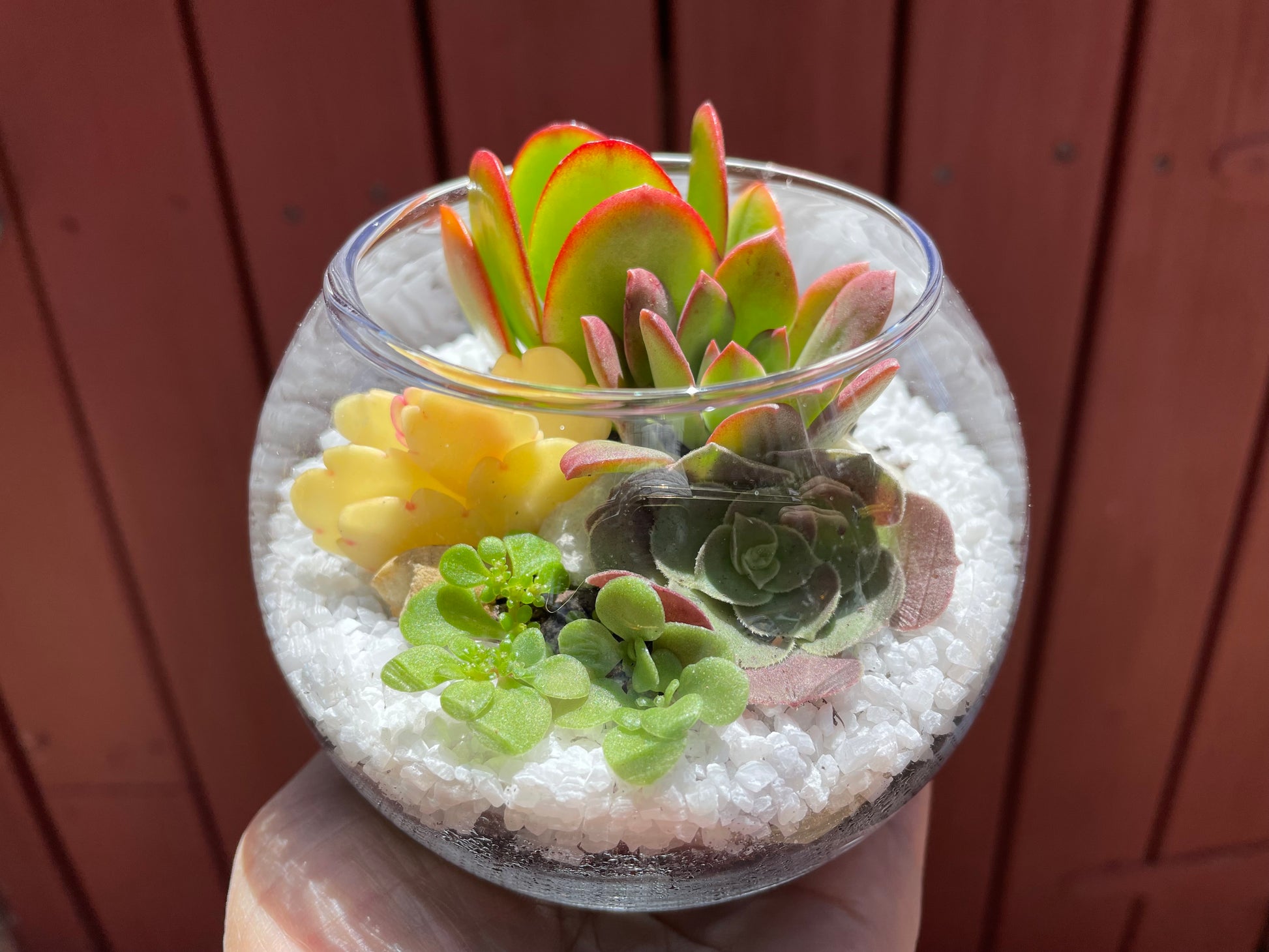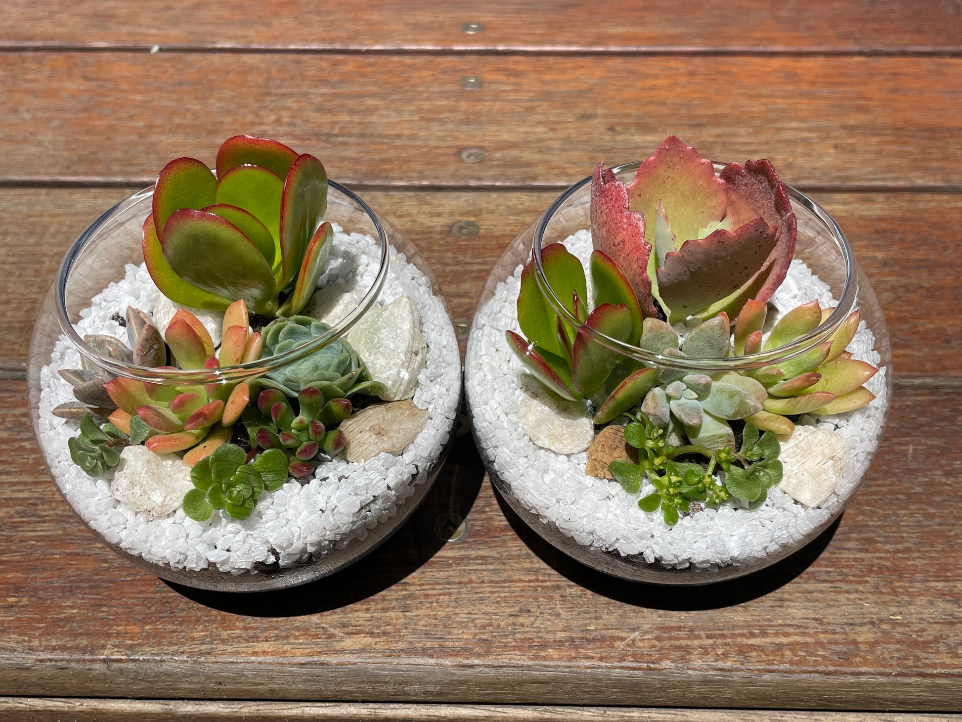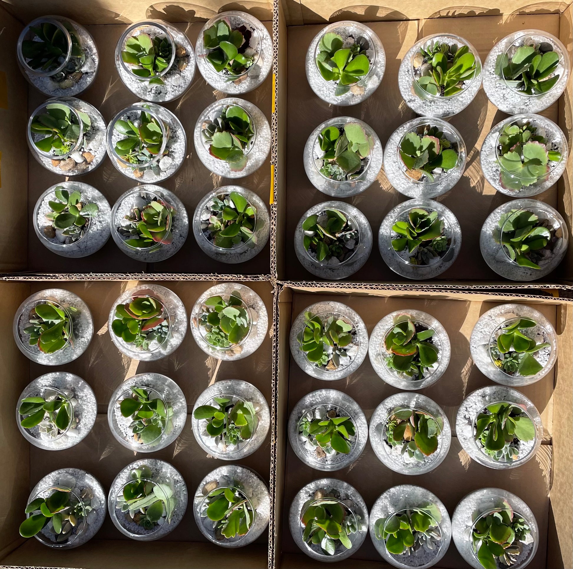 Succulent Favours: Explore a variety of succulent arrangements in glass pots with a 6.5cm open diameter, 10cm width, and 7.5cm height. Perfect for wedding party gifts, these are $12 each. A minimum order of 10 pots is required. They need 5 days to prepare. Pick up from Gymea 2227.