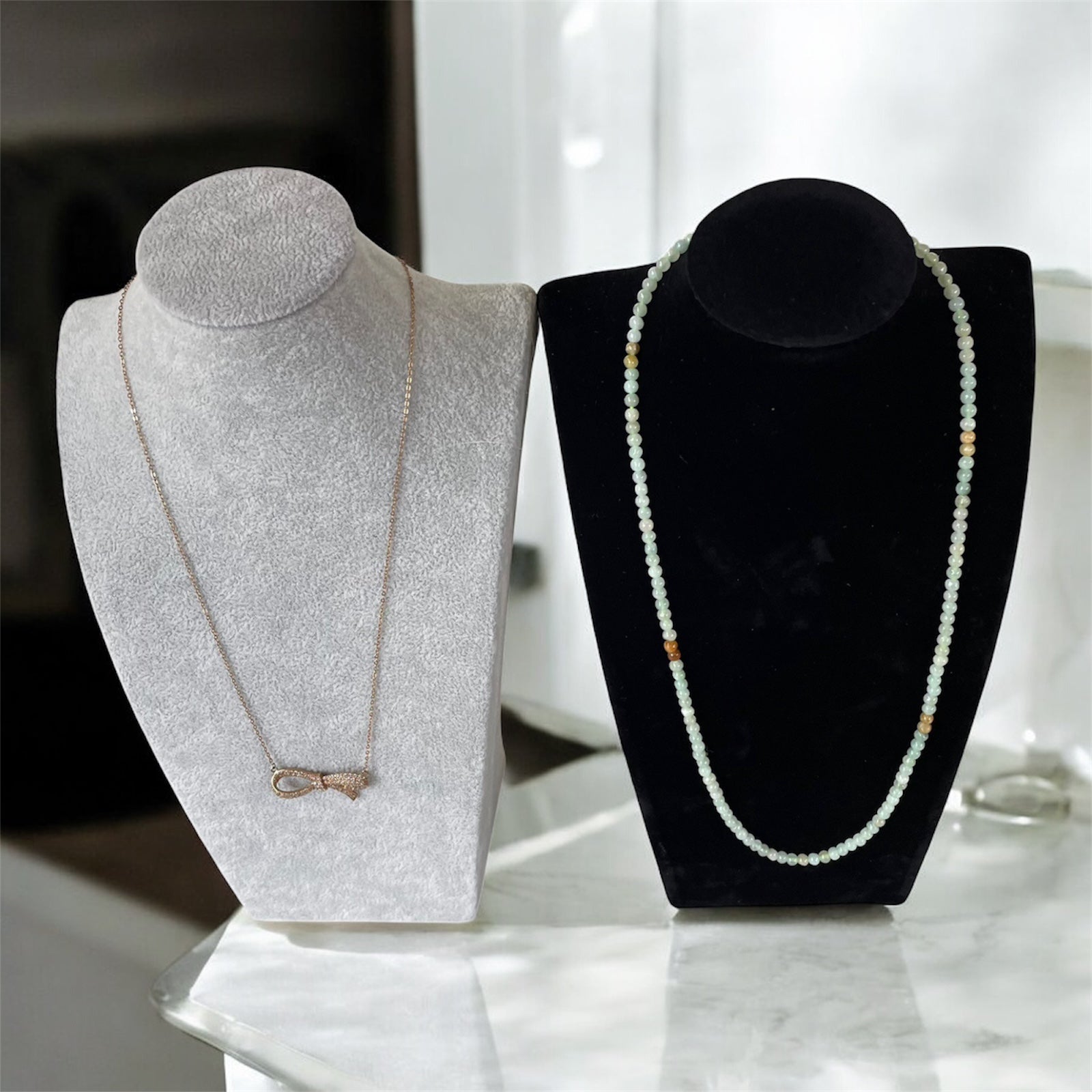 Elegant velvet necklace bust stands, 25cm tall – perfect for displaying chains, pendants, and statement pieces. Available in black and grey to match any showcase or market stall setup.